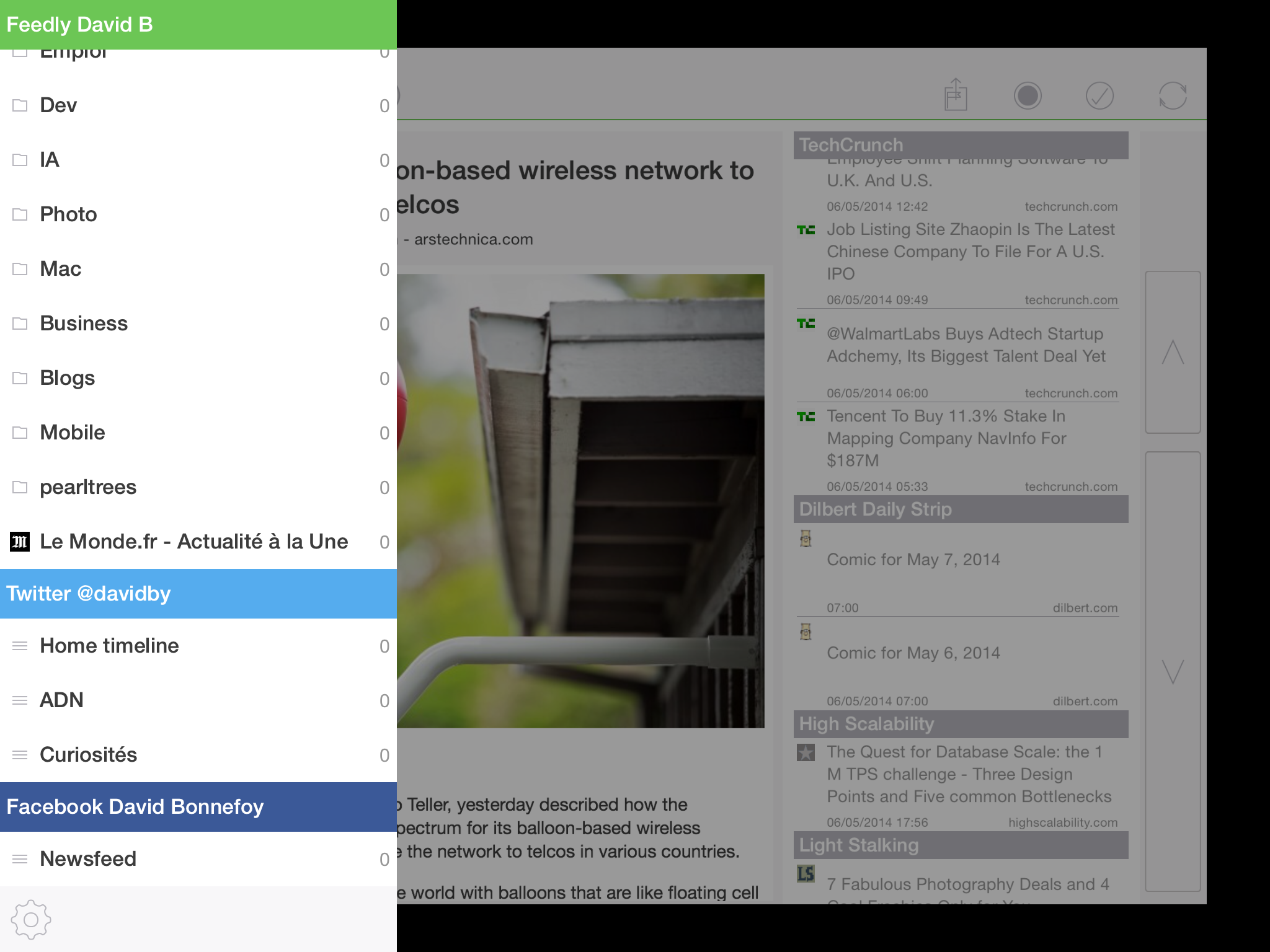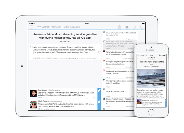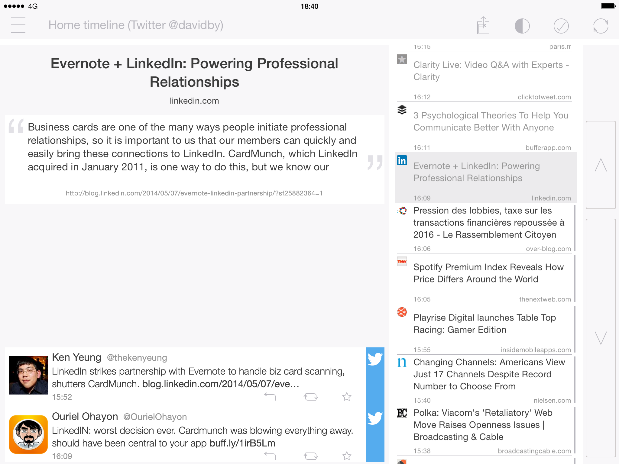 All your news streams are in one place. OneReader aggregates RSS feeds (synchronizing with Feedly and Feedbin) and articles exchanged on Twitter, Facebook, LinkedIn and App.net.