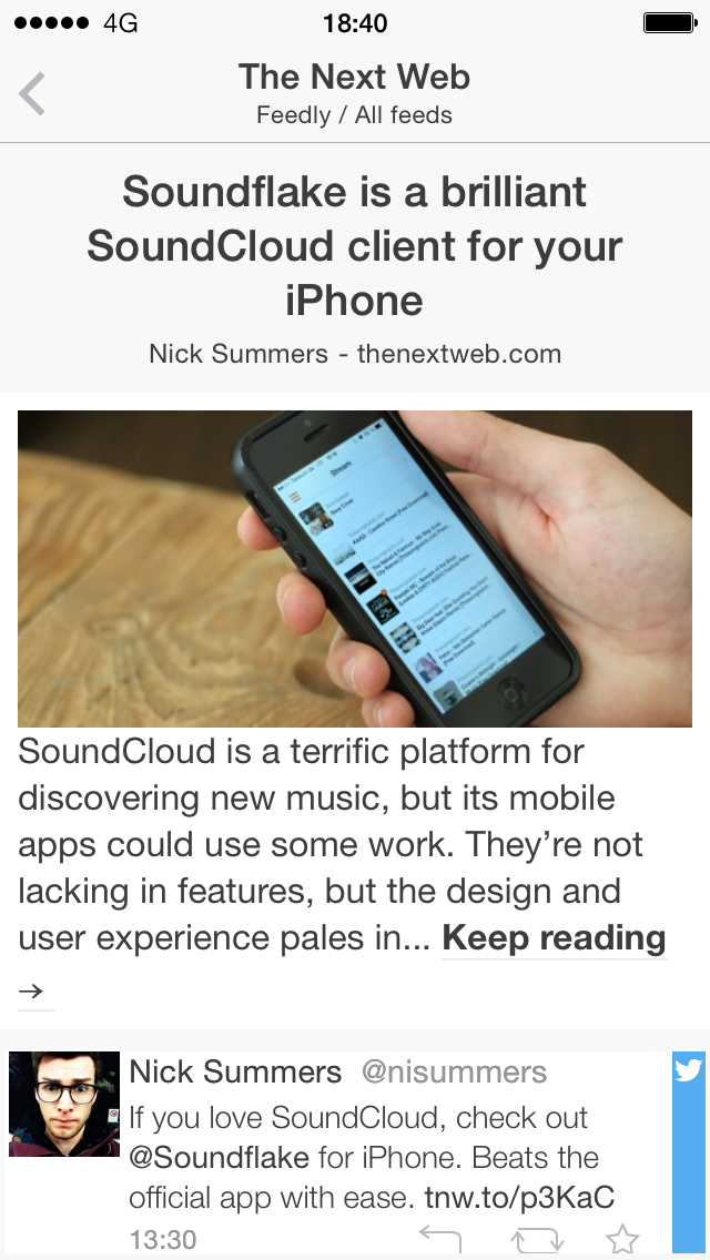 Your social network timelines are presented as a stream of articles. Only shared articles are shown, all other content is ignored. The original posts become comments to the shared articles.